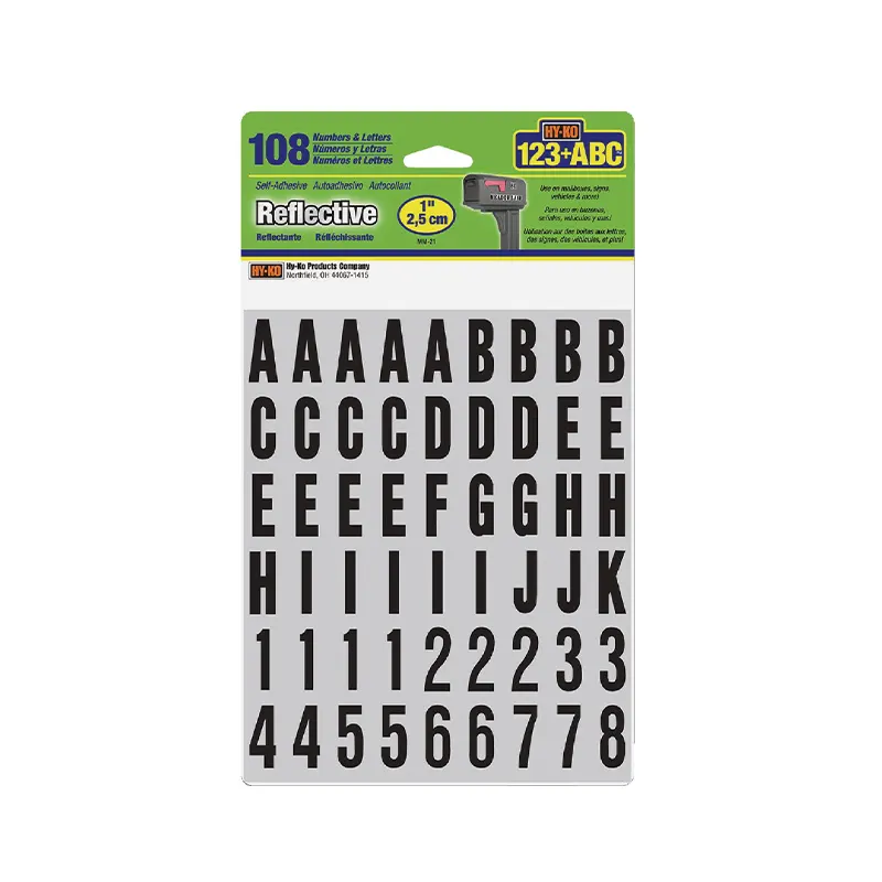 Hy-Ko reflective numbers and letters features a grey background and black characters that can be used on mailbox or post for high visibility. It is weather-resistant, durable and easy to see in bad weather and darkness.