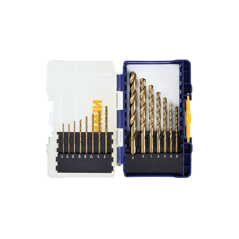 Constructed of M-35 5% cobalt high-speed steel for super abrasive resistance in tough metals. 135-degree split point reduces feed pressure for easier penetration without work hardening. The newly redesigned IRWIN Accessory Storage Cases are visibly better.  The drill bit set has clear lids for easy viewing of content and are stackable for easy traveling and storage. Sliding latch design provides added security. They feature a patented bit-bar design for easy bit removal and customizable assortments of bits. Set Includes – (2) 1/16 In., 5/64 In., (2) 3/32 In., 7/64 In., (2) 1/8 In., 9/64 In., 5/32 In., 3/16 In., 7/32 In., 1/4 In., 5/16 In., and 3/8 In.