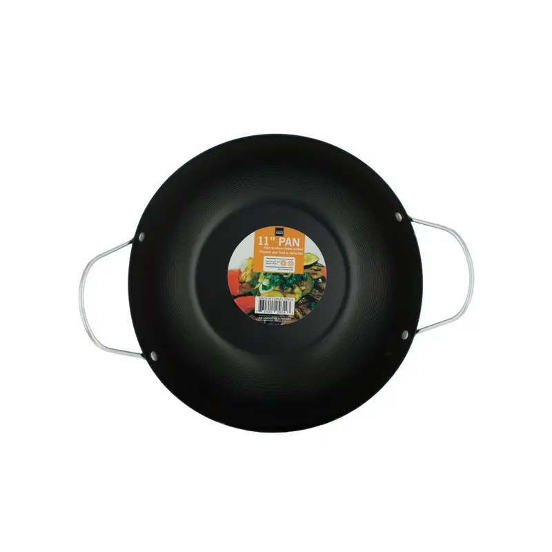 Prepare food to perfection with this All Purpose Stir Fry Pan featuring a round metal pan with ribbed texture walls, metal handles and an easy-to-clean coated surface. Not just for stir-frying, this pan can be used for shallow or deep frying, steaming and simmering foods. Pan measures approximately 11″ in diameter x 3″ deep with 2″ tall handles.