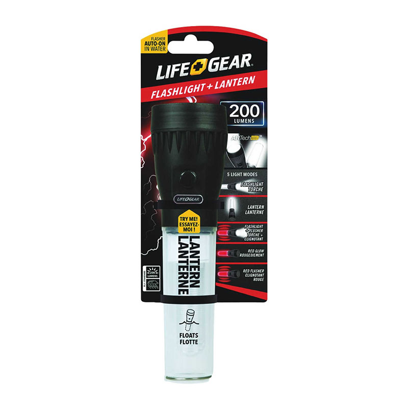 2-in-1 water resistant, floating flashlight and area lantern with emergency flasher. Features a 200-lumen LED flashlight, a 100-lumen LED area light, and an emergency flasher all in one. Contains 5 light modes, is water and impact resistant. Floats in water. Auto-off in 1-hour. Flashing mode turns on automatically when placed in water.