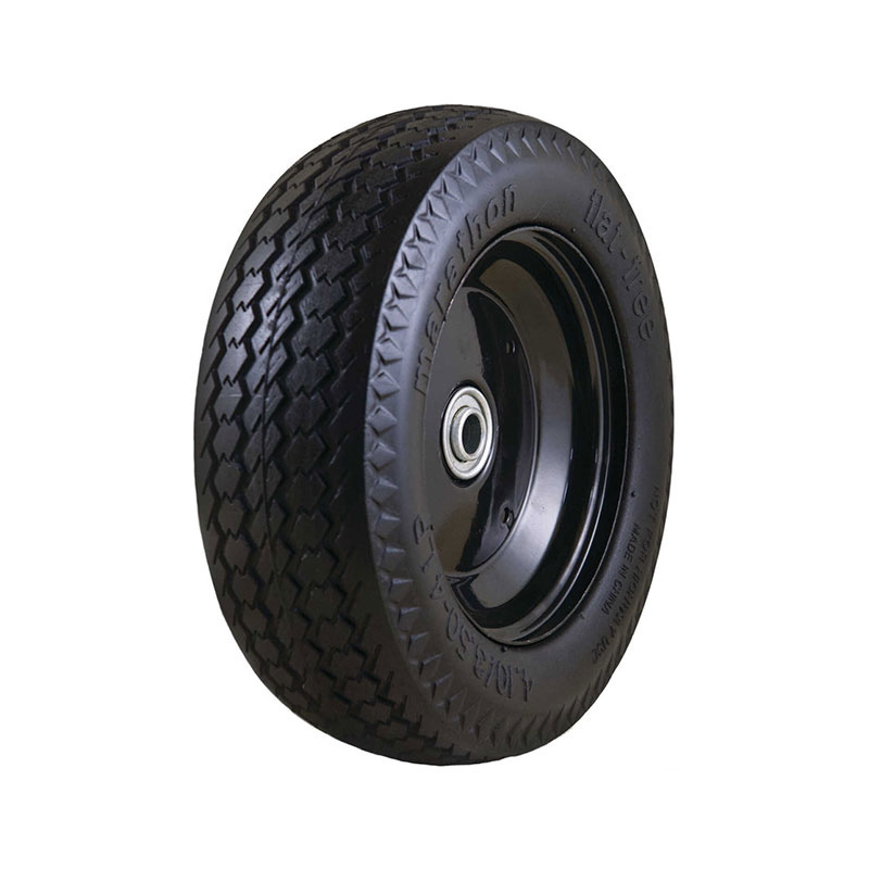 Designed to fit the majority of hand trucks, generators, pressure washers, garden carts, and other small equipment. Tire is made out of solid, polyurethane foam. It provides the bounce and cushion of an air filled tire with the benefit of never going flat. Tire size is 4.10/3.50 to 4″. Tire diameter is 10″. Tire Width is 3.3″. Tire comes mounted on a steel rim with a 2.25″ offset hub and 5/8″ ball bearings. The included parts kit contains a variety of spacers and 3/4″ bearings to meet various hub and axle configurations to help adapt it to the equipment. Tire load capacity is 300 lbs.