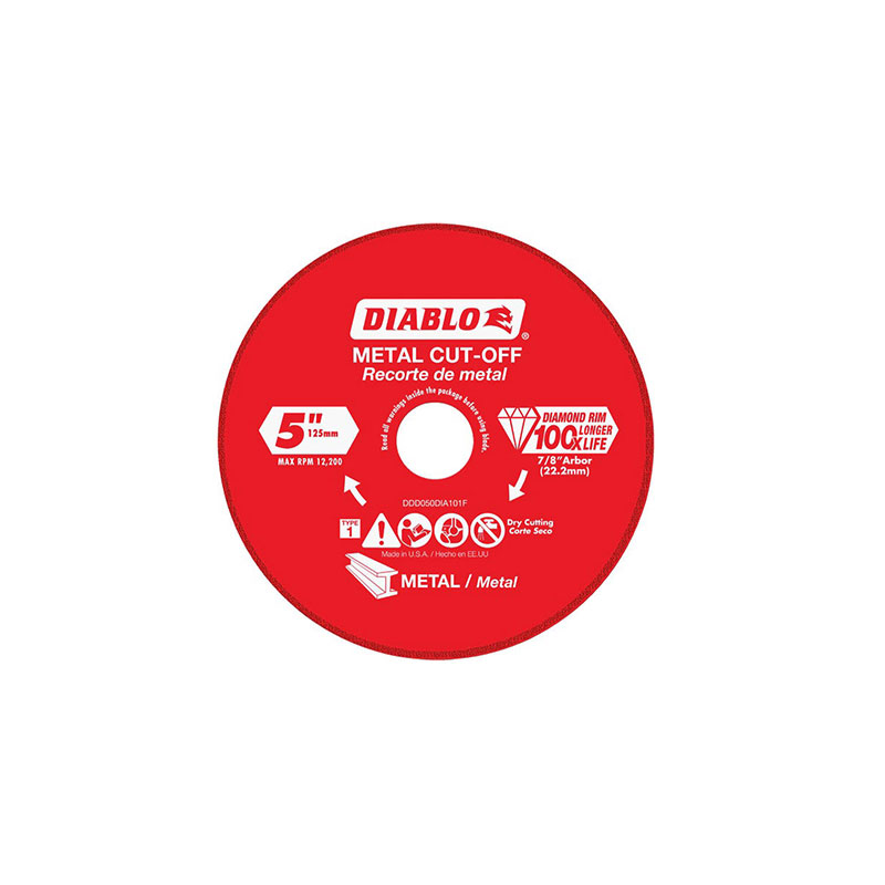 This 5-inch metal cutting diamond cut-off wheel provides premium performance and increases productivity. Advanced diamond technology for up to 100 times longer cutting life versus standard bonded wheels. Will not shatter or explode if dropped. Advanced electroplating process for even distribution of diamond abrasive cutting edge. Maximizes cutting even in extreme applications such as rebar, angle iron, cast iron, and steel bar.