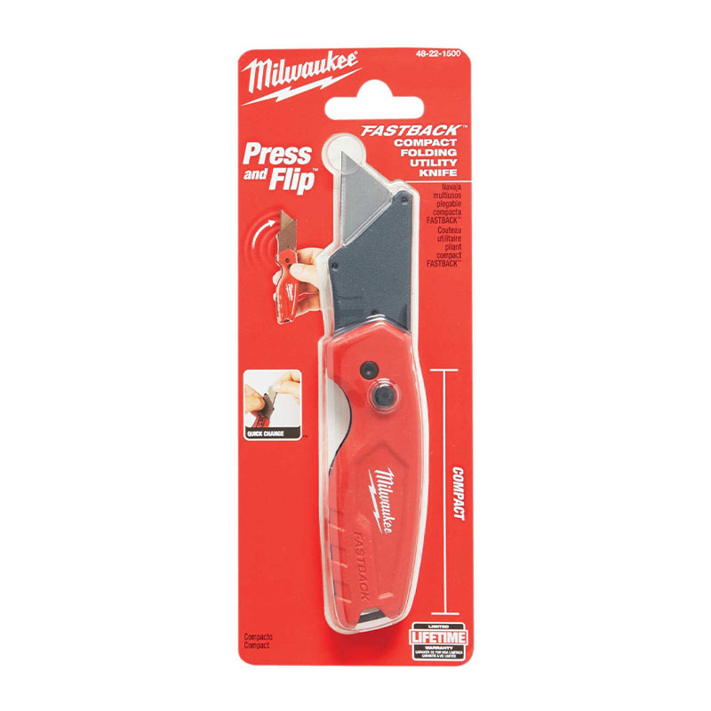 The Milwaukee Fastback Compact Flip Utility Knife is designed to improve user productivity. Press and Flip 1-handed opening provides fast access to the blade. Tool free blade change allows the user to quickly and easily insert a new blade. Its compact design makes it easy to carry in the user’s pocket or tool belt.