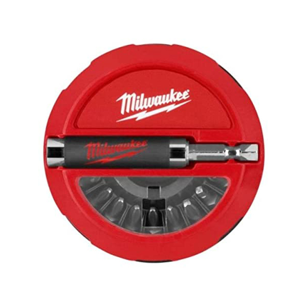 Milwaukee Tool Shockwave 20-Piece Drive guide set includes most commonly used bits such as Phillips P1 drive, seven Phillips P2 drives, Phillips P3 drive, square drive S1 drive, three square drive S2, square drive S3, torx T15 drive, torx T20 drive, torx T25 drive, slotted SL6-8 drive, slotted Sl8-10 drive, magnetic drive guide and magnetic puck case.