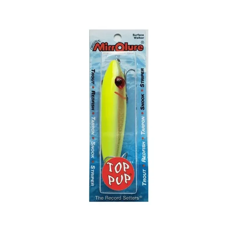 The MirrOlure Top Dog Pup is a compact, topwater lure designed to deliver explosive surface strikes from inshore predators. Its proven “walk-the-dog” action closely imitates injured baitfish, making it a go-to choice for anglers targeting aggressive game fish in shallow waters.