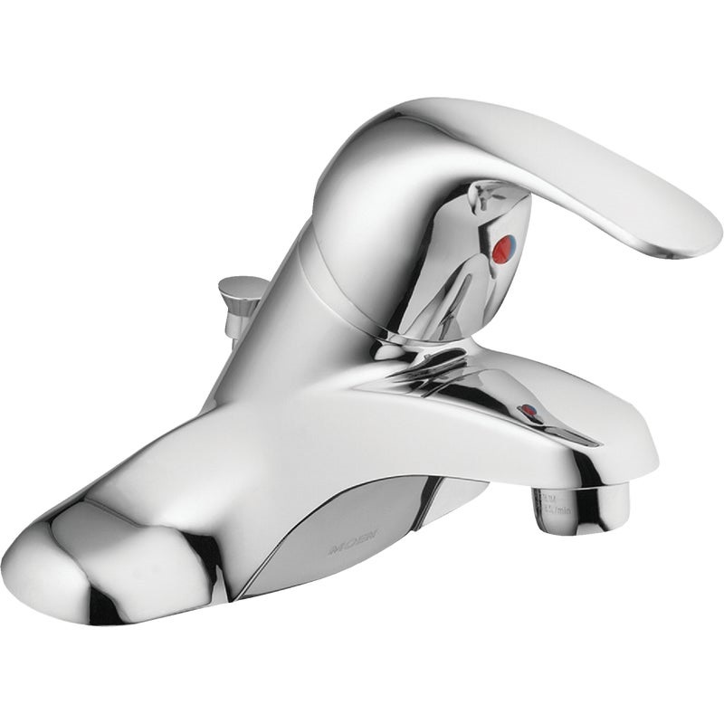Moen Adler Chrome 1-Handle Lever 4 In. Centerset Bathroom Faucet with Pop-Up. Adler single metal handle lavatory faucet with 50/50 pop-up. 1.2 GPM (gallons per minute) flow rate. Solid brass construction, brass waterways, washerless cartridge. 4″ centerset, 1/2″ I.P.S. connectors. ADA, CSA, and NSF certified. Chrome finish.