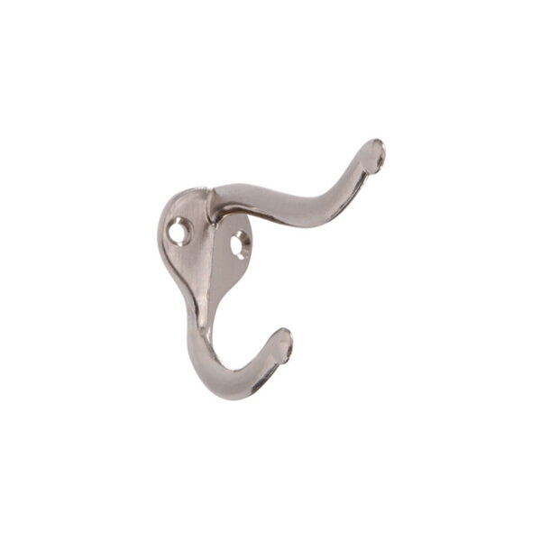 Hillman Hardware Essentials satin nickel double clothes hooks 2 Pack feature two contemporary style prongs, great for hanging clothes, coats, towels, hats, etc. Designed with two beveled holes so your hanger sits flush against the wall. Available in different finishes and styles to meet your decorating needs.