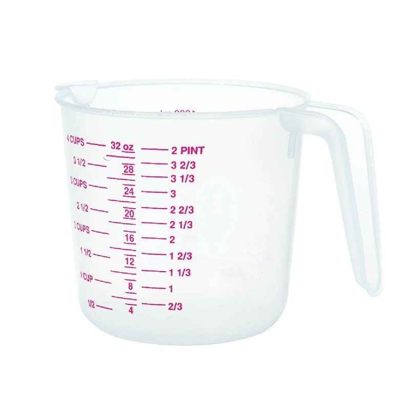 Standard and metric equivalents. White plastic. Dishwasher safe.