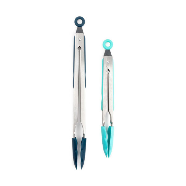 Ideal for tossing salads, turning food on the stove or oven, and removing items from boiling pots. This set of 2 locking tongs is constructed from stainless steel with silicone grips and tips. Pull locking mechanism for flat storage or loop end to hang. Heat-resistant silicone tips to protect nonstick cookware.