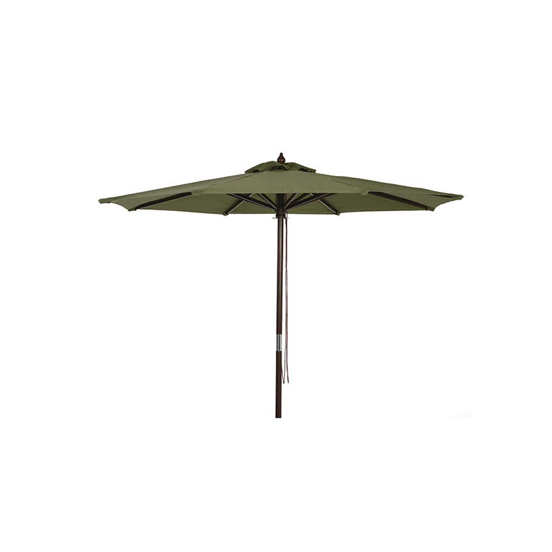 Decorative wood pole market umbrella. Features a durable polyester umbrella with 8 ribs and pulley system. Solid 7 Ft. 7 In. wood pole supports the umbrella. Vinyl storage bag included for convenient storage.