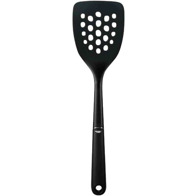 Black nylon turner is perfect for nonstick cookware and stir frying. Provides drainage when working with oils or poaching liquids.
