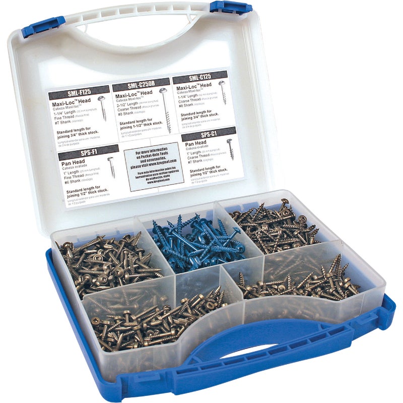 This kit contains 5 of our most popular self-tapping screw sizes for pocket hole joinery. Use a 1″ screw in 1/2″ thick stock, a 1-1/4″ screw in 3/4″ stock, and a 2-1/2″ screw in 1-1/2″ stock. Self-tapping No. 2 square drive. Approximately 675 assorted screws. Self-storing box.
