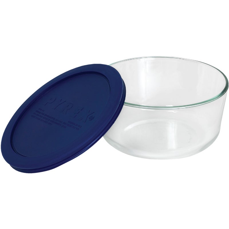 Includes: (1) 7 Cup Round Glass Food Storage Container with Blue Lid.