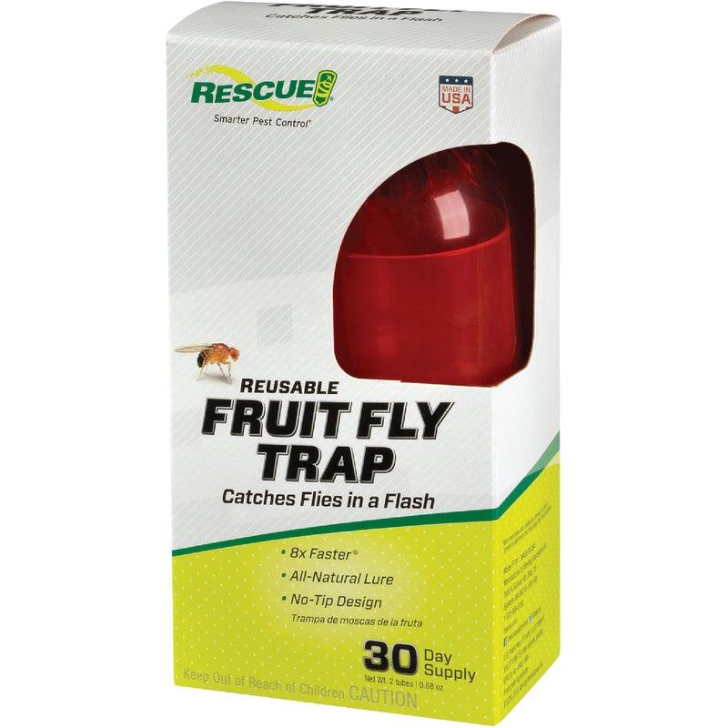 Reusable fruit fly trap. Catches fruit flies that are attracted to fruit, vegetables, and food scraps. Features food-based, liquid lure and color proven to attract fruit flies. Safe for use around food, non-toxic. No poisons or killing agents used. Starts catching fruit flies within minutes. Includes (2) 15 day supplies of attractant.