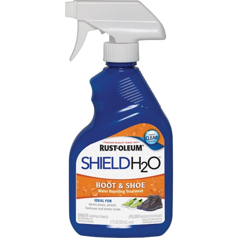 Rust-Oleum Shield H2O Boot & Shoe is a one-step, super hydrophobic, water repelling treatment designed to keep items dry longer. This crystal clear formula allows fabrics to breathe, while dramatically repelling water from the surface. Shield H2O Boot & Shoe preserves footwear against damaging moisture without changing the look or feel.
