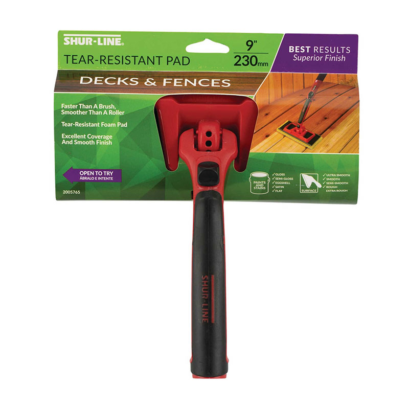 Shur-Line Durable Tear Resistant Deck & Fence pad painter provides even coverage and less splatter. Use with all paints and stains on decks, siding, hardwood floors, fences, concrete, and brick. It is designed to prevent dripping and pooling to achieve a smooth, accurate line, with even/full coverage. Comes with a soft grip handle threaded to fit most extension poles. Ideal for use with stain, polyurethane, and other hardwood floor or deck coatings without linting.