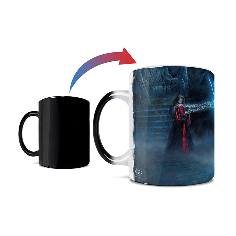 This 11 oz ceramic color changing mug displays the scene where Rey uses her lightsaber to defeat Lord Palpatine’s lighting. The exterior of this officially licensed Morphing Mugs heat sensitive mug transforms from black as hot liquid is added, revealing the hidden image in full vivid colors.