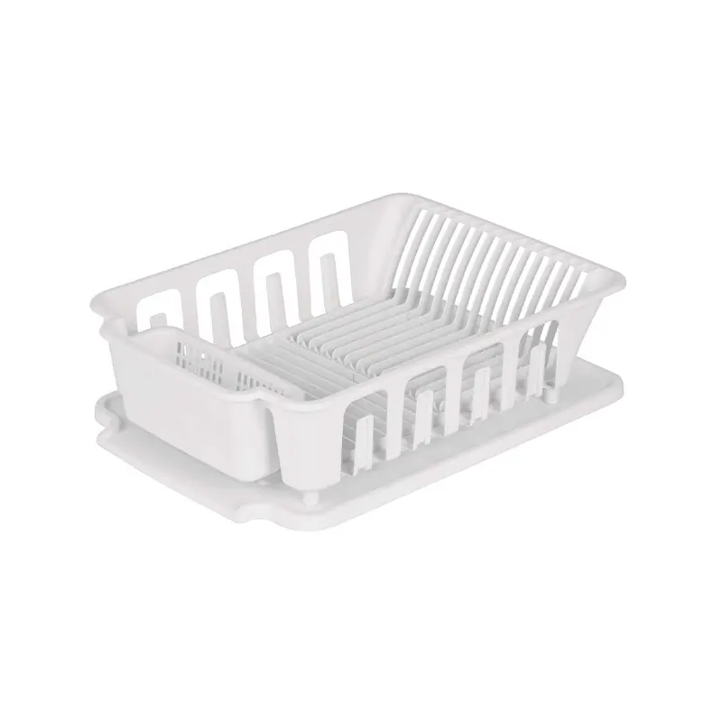 The 2-piece sink set includes a dish drainer and drainboard which are held together with snap-lock tabs, yet detach easily for cleaning. The inclined drainboard allows excess water to flow easily into the sink.