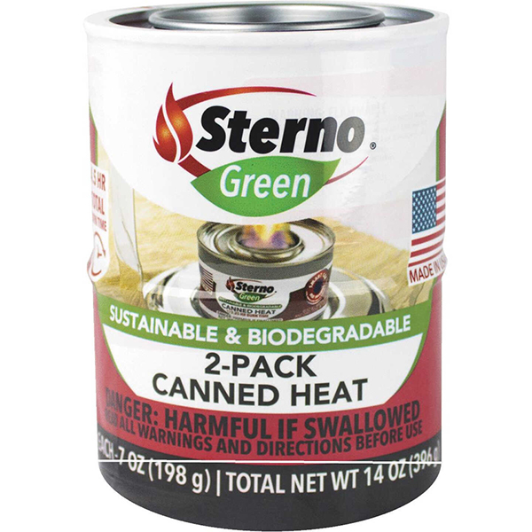Sterno portable canned cooking fuel. Solid gel safety, no liquid to spill. Each can burns approximately 2-1/4 hours.