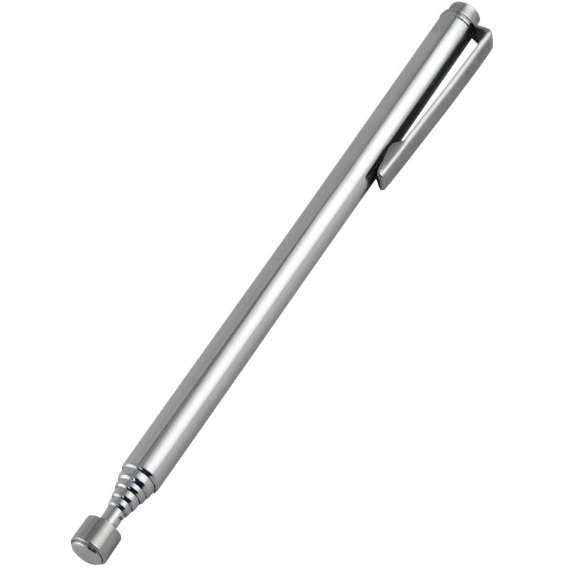 Strong permanent neodymium magnet in nickel-plated telescoping holder with pocket clip. For retrieving small parts and removing dust and chips from drilled holes.