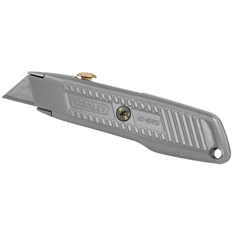 Classic and durable, the Stanley Self-Retracting Utility Knife is designed for opening cartons. It features a spring-loaded blade that retracts into the knife automatically when pressure on the slide button is released. An interlocking nose secures the blade safely between the knife halves, ensuring that the blade is only exposed when the knife is in use.