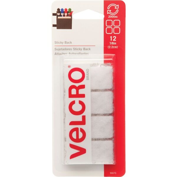 7/8 Inch adhesive backing VELCRO brand squares. General purpose for hobby and craft needs. Strong yet peels apart easily. No special tools or skills required. Easy-to-use. Blister pack card. 12 sets per package.