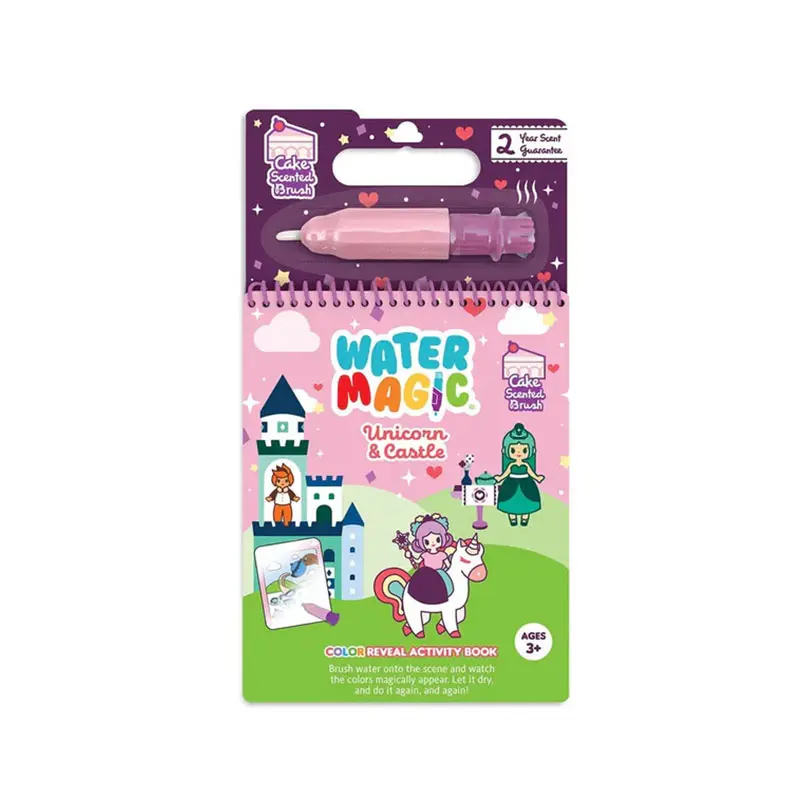 Water Magic is an activity book that is perfect for ages 3 and up. It features reusable pictures that magically appear when the brush is filled with water. The brush is scented to match the theme of the book and is mess and spill free.