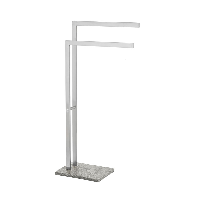A juxtaposition of contrasts – straight lines paired with coarse natural stone look characterize the bathroom series Granite. The use of high-quality materials such as rustproof Stainless Steel combined with a quadratic design and polyresin in granite look give the elements of this series an elegant, natural look. The towel and clothes stand offers space for towels and clothing on two staged, parallel arms.