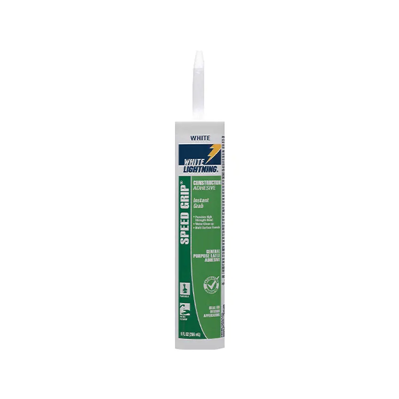 White Lightning Speed Grip white construction adhesive is compatible with plastic, wood, concrete and metal materials. Ideal for interior applications. Comes in a 9 oz Cartridge.