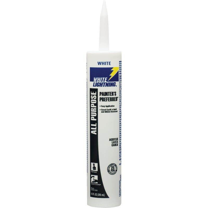 White Lightning Painter’s Preferred is a an economical general purpose acrylic latex caulk suitable for sealing interior/exterior cracks and joints. Ideal for use on doors, windows and trim. Seals cracks between drywall, wood and glass. Cured Caulk is mold and mildew resistant. Easy Application. Water clean-Up. Paintable.