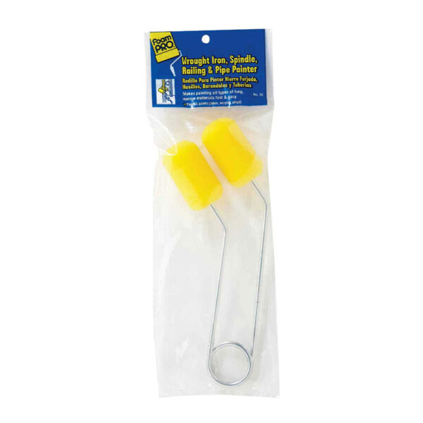 Wrought iron painter paints 2 sides at once. High-capacity, resilient foam conforms to irregular surfaces. Ideal for wrought iron, wood spindles, railing, pipe and security bars. For all latex and oil-based paints.